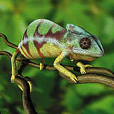 -El camaleón permanece inmóvil mientras acecha a los insectos. Sus grandes ojos saltones pueden girar y hasta ver en dos direcciones a la vez.